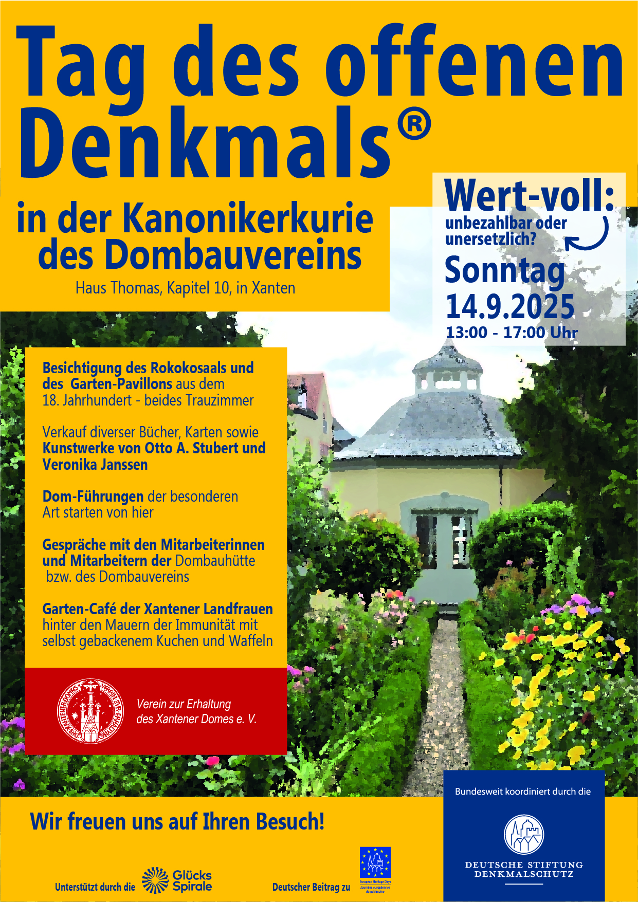Am Sonntag, dem 08. September, ist es wieder soweit: Der Tag des offenen Denkmals lädt deutschlandweit dazu ein, historische Schätze zu entdecken. Der Xantener Dombauverein lädt Sie herzlich dazu ein, das ehemalige Wohnhaus von Professor Dr. Bader mit dazugehörigem Garten-Pavillon und einem versteckten Garten zu besichtigen. Dieses beeindruckende Gebäude, eine Kanonikerkurie aus dem 18. Jahrhundert, beinhaltet unsere Geschäftsstelle und den historischen Rokokosaal. Es wurde von unserer Dombauhütte dieses Jahr renoviert. Jetzt gerade wird mit Unterstützung der Deutschen Stiftung Denkmalschutz der Garten-Pavillon aus dem 18. Jahrhundert aufwändig renoviert.